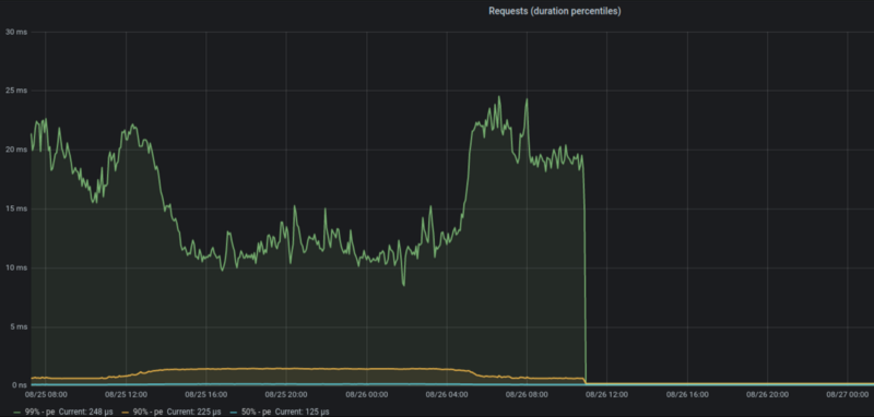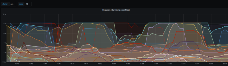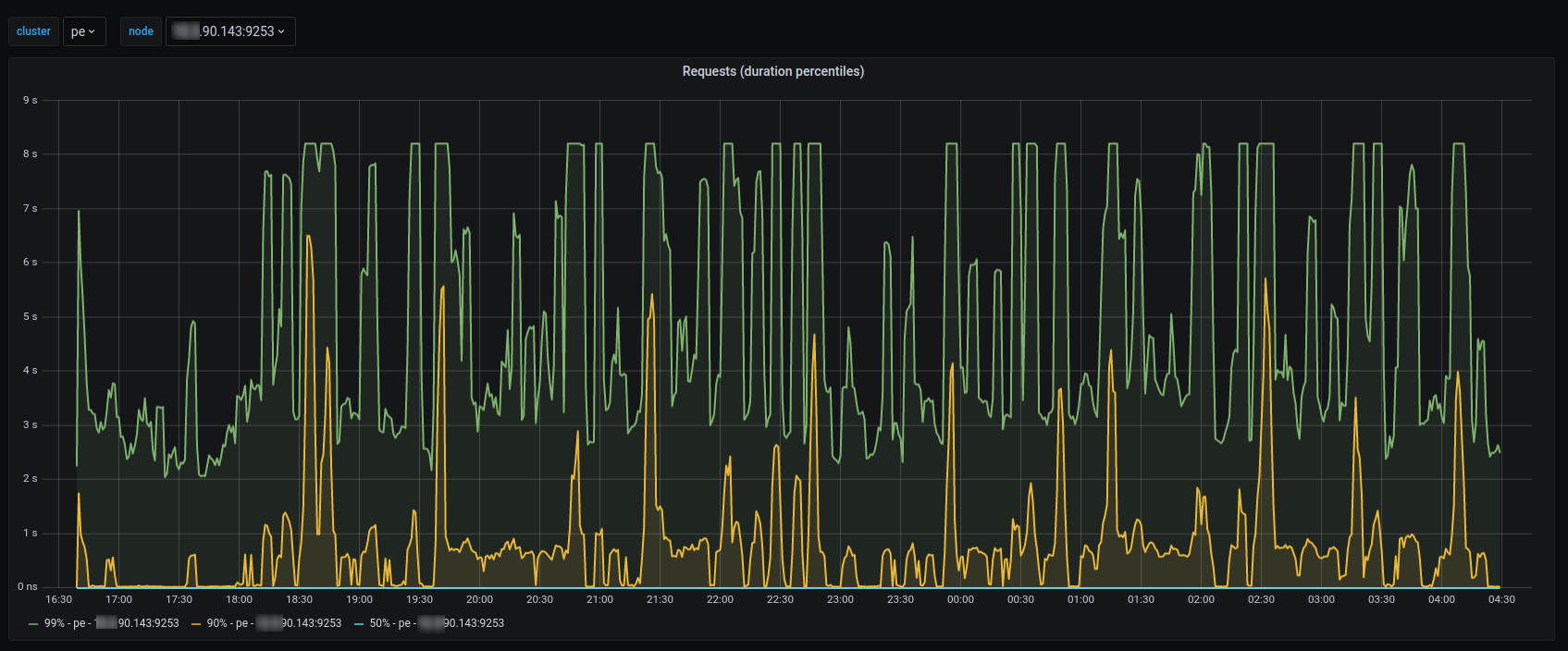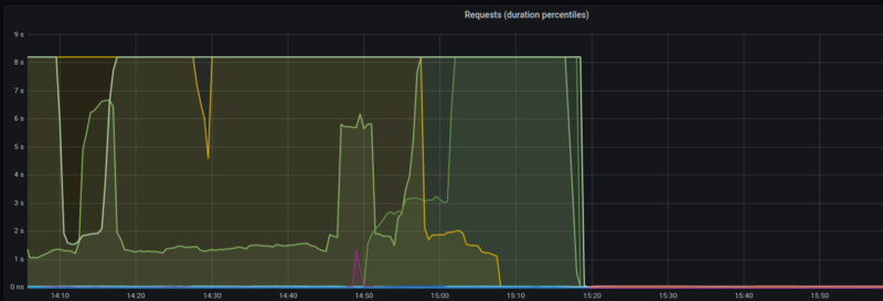 After some time that the traffic had picked up, we started getting alerts from our SLI metrics that our latency error budget is burning too fast. That alarmed us and looking at our graphs we noticed that the majority of our nodes reported high latencies for the 90 and 99 percentiles.