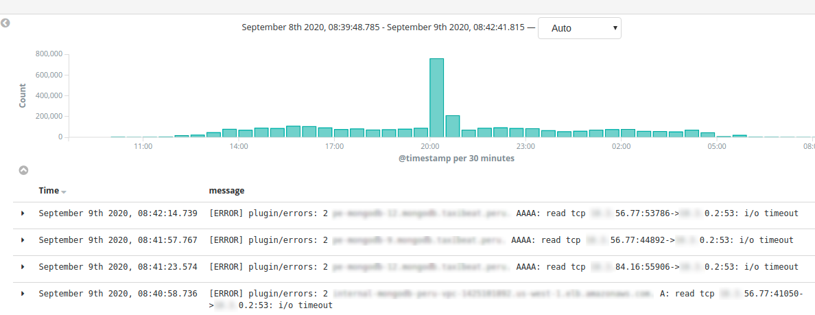 Looking at our node local cache DNS logs we noticed an unusual amount of logs coming in. Instead of having a handful of logs due to various pods restarts we had hundreds of logs per minute. As shown in the next graph all the logs were errors about TCP timeouts towards our upstream server.