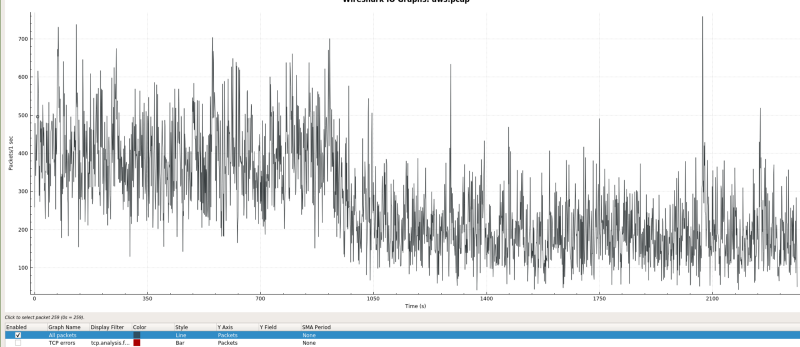 What initially crossed our minds was that we are rate limited by our upstream provider, which in our case happens to be AWS. Their documentation states that we have a limit of around 1k packets per second. Analyzing, though, the same TCPDUMP and getting the I/O graph showed us that we were not close to 1k mark.
