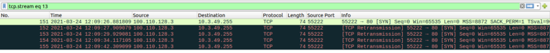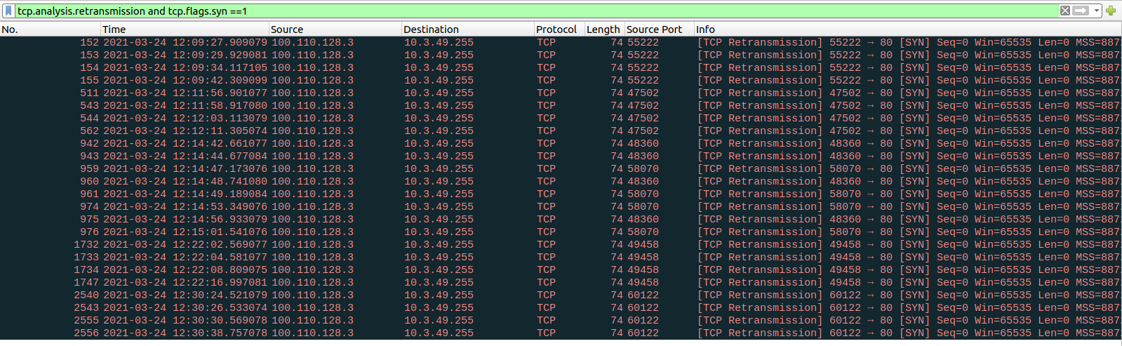 Since none of our experiments on the application level were fruitful we decided to see what is happening in the network layer from one of our instances using tcpdump. Capturing and examining some traffic we initially noticed that we had several retransmissions of SYN packets.