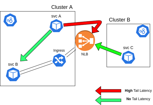 Summarizing, service A from cluster A accessing service B from cluster A using NLB endpoint through ingress controller and NLB was seeing high tail latencies. Service A from cluster A accessing cluster’s A service B using kubernetes native DNS endpoint didn’t see high tail latencies. Service C from cluster B accessing service B using NLB endpoint was also not seeing high latencies.